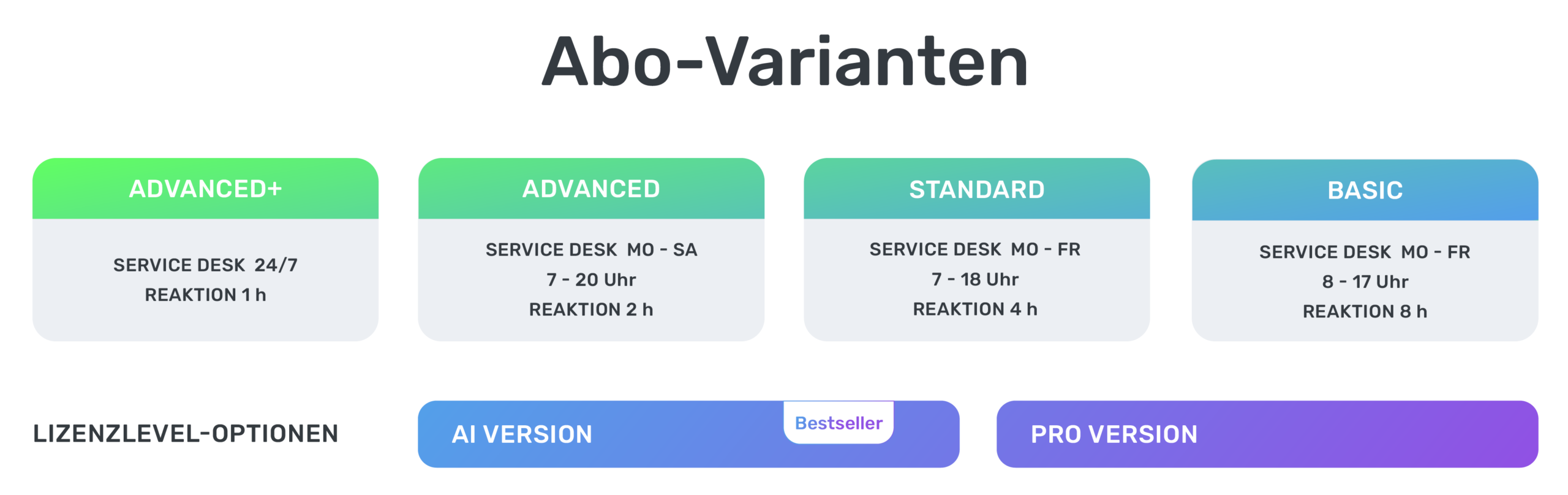 Neu stehen die beiden Lizenzvarianten AI und Pro über alle Abo-Varianten hinweg zur Verfügung. Damit schaffen wir mehr Transparenz und bieten ein Lizenzmodell, das sich gezielter an den tatsächlichen Anforderungen unserer Kund:innen orientiert. Die KI-Lizenz, die bisher nur in der Abo-Variante Advanced verfügbar war, ist künftig in sämtlichen Abo-Varianten erhältlich.